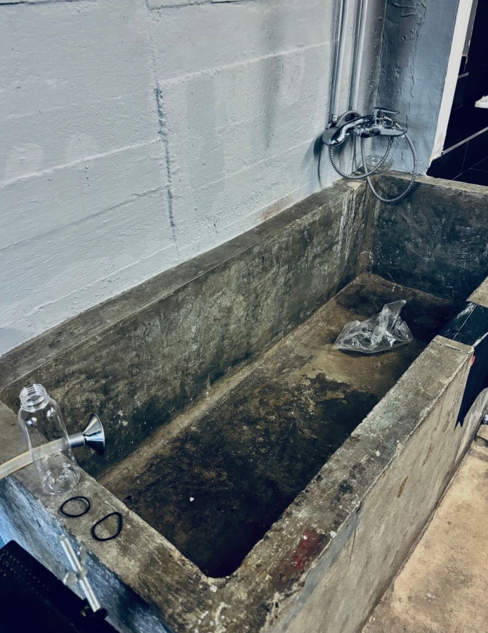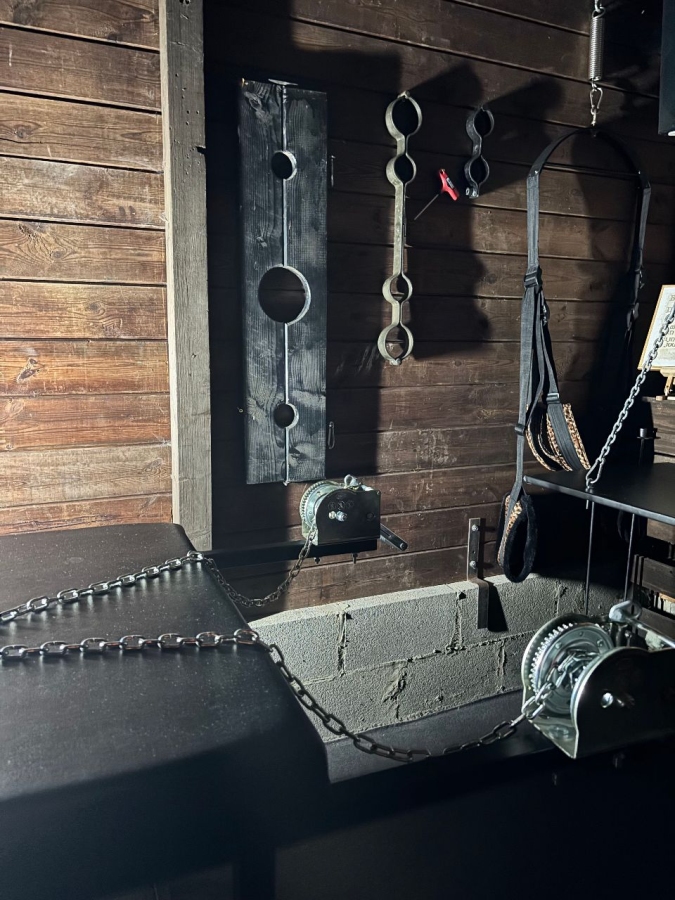 - 2 Folter- und Verhörräume mit Käfigen, Streckbank, Fesselbank, Strafpferd, Folterbänken, Clejuso Hand und Fußschellen, schwere Eisen-Restraints.